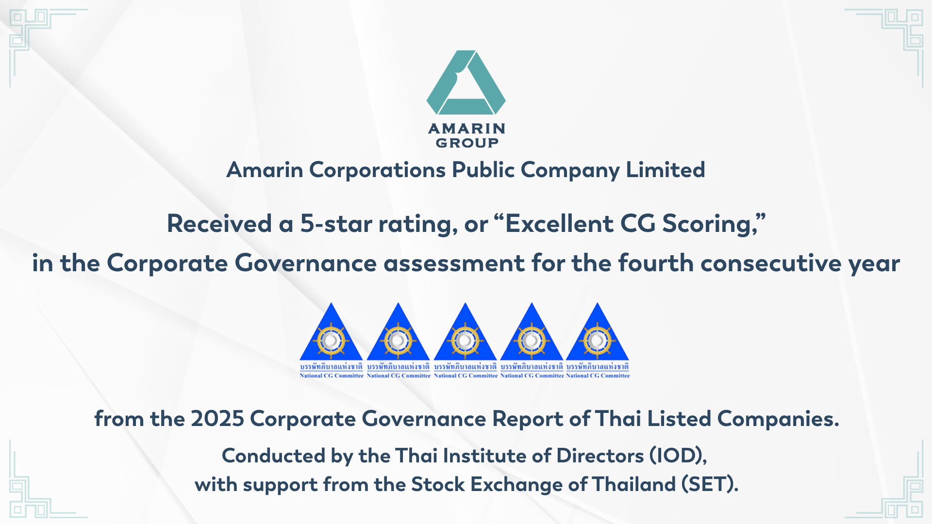 Amarin Corporation Public Company Limited (AMARIN) has been awarded a 5-star rating or “Excellent” (Excellent CG Scoring) for the fourth consecutive year in the Corporate Governance Report of Thai Listed Companies 2025 (CGR) conducted by the Thai Institute of Directors Association (IOD), with support from the Stock Exchange of Thailand (SET).
